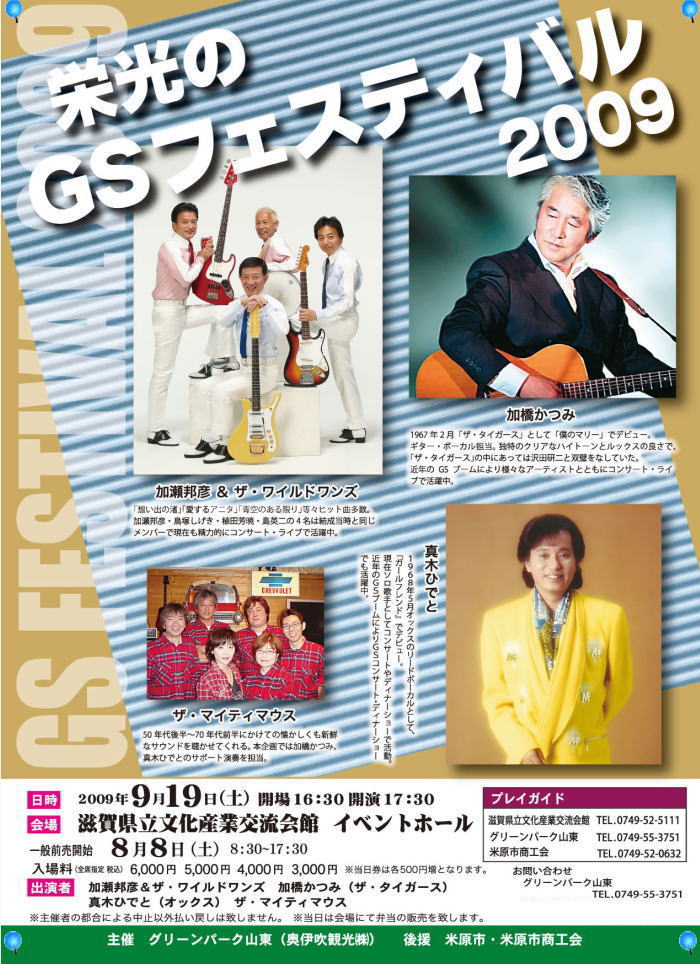 長いようであっという間でした。 賑わいを見せていた川の駅「はちけんや」の会場も 撤去されて、なんだか切ない気分です。 水都大阪との連携事業として運航してきた『なにわ歌声クルーズ』 なんと好評につき、11/23日まで引き続き運航いたします! 秋の風情と水面に響く歌声を是非ともお楽しみください。 ただ変更点がございまして、 ※大阪城~桜ノ宮方面を行く「大川Bコース」のみの運航となります。 ※運航時間が①14:00~15:30、②16:00~17:30となります。 ※金土日および祝日の運航予定ですが、状況によっては運航しない場合がございます。まずはコチラまでお問い合わせください。 フリーダイヤル0120-728-962(なにわクルーズ) 10月11日(日)は、神戸ハーバーランドにてラジオ関西まつりが開催され、その中の1コーナー「震災復興の街を歩くミニウォークラリー」を我々アトムブラザーズがラジオ関西と協力して企画・実施しました。 このウォークは、震災から復興を遂げた神戸の街をラジオ関西パーソナリティーの方々と一緒に歩き、実際に震災にゆかりのあるポイントで震災当時を知る語り部の方にお話していただくという内容。 この日は絶好のウォーク日和となり、当日参加者を含め計119名がミニウォークに参加。「三上公也の情報アサイチ!」メンバーと楽しい会話しながら街を歩き、終始笑顔の絶えないウォークラリーとなりました。 参加者の方々からは、改めて震災について考えるいい機会になりましたという嬉しいお声をたくさんいただき感無量です。普段のウォークラリーとは一味違った意義のあるイベントになったと自負しております。 ラジオまつりともうまく連動してイベント全体の盛り上がり感を創出する事ができたと思います。モザイク周辺は終日たくさんのお客様、一般来館者で賑わいました。 一緒に歩いて下さったパーソナリティーの方々、語り部の方々ほか、今回のミニウォークラリーに携わった全ての皆さまに感謝いたします。 話が前後しますが、10月2日(金)の住之江サンセットライブは、「ファウンタイム」の70年代ディスコステージをお送りしました。 住之江競艇場はディスコ会場にタイムスリップし、当時を懐かしむお父さんに大盛り上がりのステージとなりました。 さて気がつけば、5月から長きに渡ってお送りしてきた住之江サンセットライブも残すところあと2回となってしまいました。 音響・照明スタッフも含め、ちょっぴりしんみりとした気分です。 あのカラめんたい弁当も、司会の吉田麻衣子さんも・・・ 忘れられません。打ち上げしたいです! いやいやまだ終わっていません。次回10/14(水)の住之江サンセットライブには、GSの大御所「マイティーマウス」が登場します。皆様、10/14の住之江競艇にご来場ください。 9月20日(日)はカラオケが盛んな兵庫県川西市→アステ川西にて 美人演歌歌手「山本みゆき」さんをゲストに迎えてカラオケコンクールが行われました。 今年で5回目の開催となるカラオケコンクール。入場無料ということもあり、たくさんの歌好きのお客様が集まりました。 審査員には森浦友記夫(作曲家・編曲家)、曽我俊之(音楽プロデューサー・元キングレコード大阪支社長)、千野桂子(音楽プロデューサー)、望月潔(TEMPO175振興会副会長・㈱ナッツベリー代表取締役)、ゲスト審査員には山本みゆきさん!!! 決勝戦の後には、山本みゆきさんのライブや八代亜紀のコンサートチケットなどが当る「おたのしみ抽選会」も行われ、閲覧に来られた方も満足の素晴らしい一日となりました。 9/19日(土)は滋賀県立文化産業交流会館 イベントホール(1900名収容)にて「栄光のGSフェスティバル2009」を弊社制作で開催しました。 出演は「加瀬邦彦&ザ・ワイルドワンズ」「加橋かつみ(タイガース)」「真木ひでと(オックス)」そして「ザ・マイティマウス」という、もはや伝説といえる錚々たる顔ぶれ。僕もこの機会にHPなどで勉強させてもらいました。 THE WILD ONES OFFICIAL WEB SITEはコチラ→http://www.wildones.co.jp/ 当日、音響・照明スタッフと楽器車がシルバーウィーク連休の渋滞にひっかかり、さらに11台の玉突き事故に遭遇、到着が1時間半遅れるというハプニングが発生しましたが そこはさすがの現場対応、リハーサルを短縮するなど出演者全員の協力もあって、なんとか予定の開場16:30には間に合いました。 会場には1000人を超えるお客様に来場いただき、盛り上がりのうちに終演、大成功のイベントとなりました。 |