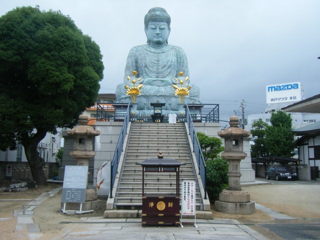話を遡りまして、7/1日の話。この日は午後から格清先輩と神戸へ。確実に雨が降るであろうと思われる中、10月に開催されるウォークラリーイベントのコースをロケ班してきました。 ストップウォッチ片手に測定メーターをコロコロ押しながら、写真を撮りながら、さらにカサを持ちながらの6.8キロ、なかなかいい運動になりました。 今回のコースは、ハーバーランド高浜岸壁をスタートして兵庫区に入り、七宮神社や清盛塚などの史跡を巡る魅力満載のコースです。その中でも圧巻だったのは、 出ましたドーンと兵庫大仏! 見上げるとなんか恐い。。。 奇跡的に雨は降りませんでした。 大仏様のおかげです、チーン。 |